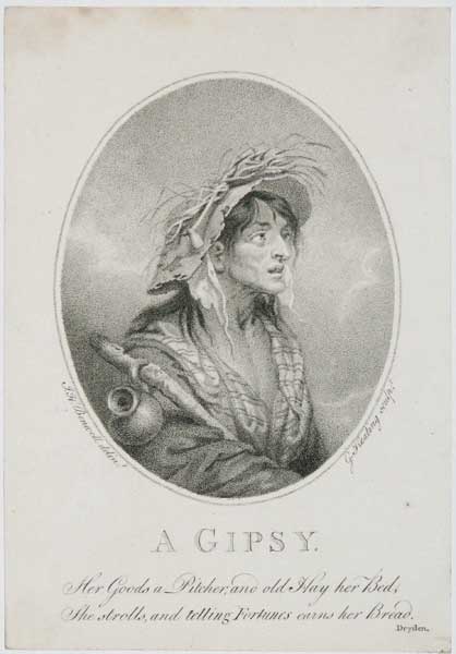 A Gipsy. Her Goods a Picher; and old Hay her Bed, She strolls, and telling Fortunes earns her Bread. Dryden.