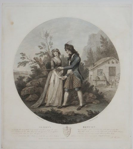 Jemmy's Return. At length the merry Bells rung round I could na guess the cause, But Rodney was the Man they said, who gained so much applause...I blush'd, consented and reply'd; Adieu to Robin Grey. To Lady Rogers, this Print is with the greatest respect dedicated by her Ladyship's most obliged Servant, J. Walker.