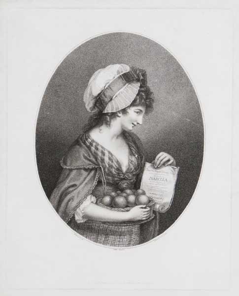 Half-length young woman, body facing three-quarter to right, head turned in profile to right, wearing a hat with ribbons, holding a basket of oranges in right hand, a paper inscribed "Theatre Royal, Drury-lane Isabella". Isabella, or, The Fatal Marriage, was a play by Thomas Southerne, which was adapated by Garrick with Sarah Siddons playing the title role. De Vesme 1288: ii/iv.