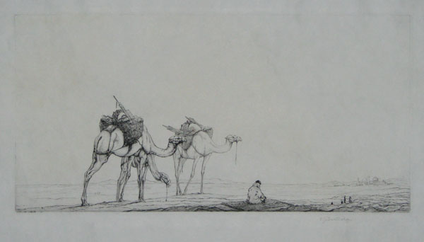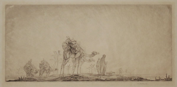 Laden camels standing at an oasis, two in water. Edward Julius Detmold (1883-1957) began etching with his twin, Maurice, and exhibited at The Royal Academy aged 13. In 1908 Maurice committed suicide and Edward, traumatised, stopped etching. In 1922 an appreciative article about the Detmolds in the Print Collector's Quarterly inspiring Edward to return to printmaking. An edition of 'The Arabian Nights' illustrated by Detmold was published in 1924.