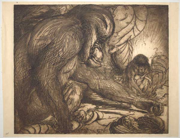 Two apes feeding. Edward Julius Detmold (1883-1957) began etching with his twin, Maurice, and exhibited at The Royal Academy aged 13. In 1908 Maurice committed suicide and Edward, traumatised, stopped etching. In 1922 an appreciative article about the Detmolds in the Print Collector's Quarterly inspiring Edward to return to printmaking.