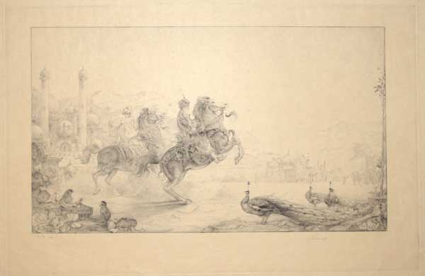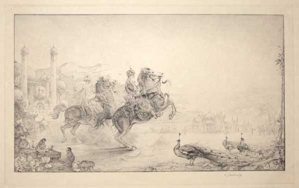 Two Arab men on horseback rear up in front of a fantastical city landscape with monkeys, peacocks and water-lilies. A state afterthe unprinted part of plate was cut down. Edward Julius Detmold (1883-1957) began etching with his twin, Maurice, and exhibited at The Royal Academy aged 13. In 1908 Maurice committed suicide and Edward, traumatised, stopped etching. In 1922 an appreciative article about the Detmolds in the Print Collector's Quarterly inspiring Edward to return to printmaking. An edition of 'The Arabian Nights' illustrated by Detmold was published in 1924.