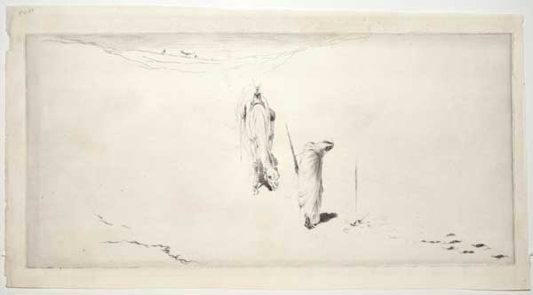 An Arab stands before this camel, rifle over his shoulder, looking down at something coming out of the ground. Edward Julius Detmold (1883-1957) began etching with his twin, Maurice, and exhibited at The Royal Academy aged 13. In 1908 Maurice committed suicide and Edward, traumatised, stopped etching. In 1922 an appreciative article about the Detmolds in the Print Collector's Quarterly inspiring Edward to return to printmaking. An edition of 'The Arabian Nights' illustrated by Detmold was published in 1924. See V&A SP.215 for a reversed colour etching of the same subject.