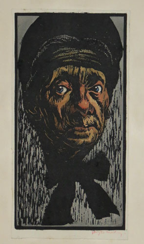 Hayden Mackey [signed in the plate.] [n.d. c.1920.] Coloured woodcut, signed. 298 x 152mm. 11¾ x 6". Trimmed and laid on board. An old man wearing a hat and a cravat. Haydn Reynolds Mackey (1883-1979) was a book illustrator and printmaker of bold coloured linocuts and woodcuts. He was a leader in representing an innovative and bold departure away from the traditional and recognised methods of printmaking.