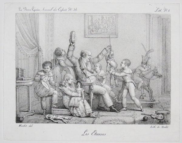 'Les étrennes' (French tradition of Surprises). A father sat in his chair surrounded by children playing with their new presents, including a tambourine, violin, drum and dolls. A child on the right is dressed as a soldier and rides a toy horse. This military theme is echoed by the painting of a military inspection which hangs on the wall. One of a series published in a children's magazine.