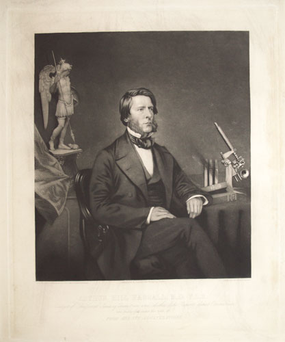 Seated portrait of Arthur Hill Hassall (1817-94), physician, chemist and microscopist known for his work in water and food safety. His book 'Food and Its Adulterations', seen here on the desk next to his microscope, was published in 1855.