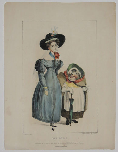 A satirical print; a tall slender woman /girl stands next to a shorter stout woman holding an umbrella and with a remarkable smile on her face as she looks up at the girl.