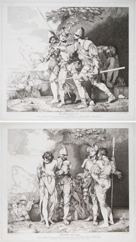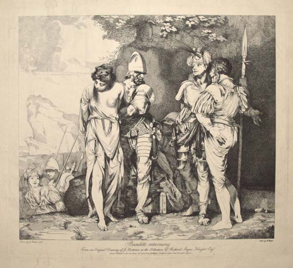 Banditti scene after John Hamilton Mortimer (1740-79), published soon after the artist's death. Influenced by the works of Salvator Rosa (immensely popular during the period), Mortimer incorporated Rosa's disturbing banditti and occult subject matter in the 1770s. This print is usually regarded as a generic banditti scene: a preparatory drawing in the collection of Richard Payne Knight (now in the British Museum) was etched by Robert Blyth and published in November 1780 with the title 'Banditti Returning'. However, a related painting by Mortimer (Newcastle, Hatton Gallery) is titled 'The Sacrifice of Polyxena'. In Euripides' plays, Polyxena was sacrificed at the end of the Trojan War to appease the gods. Ex: collection of the Hon. C. Lennox-Boyd; Ex: Collection Christopher Mendez; D'Oench 145. Frankau: Not in.