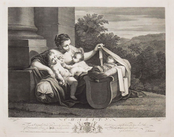 Charity. From the Original Picture of the same size, painted by Carlo Cignani in the Collection of his Grace the Duke of Devonshire: to Whom this Plate is most humnbly inscribed, By His Graces much Obliged and most devoted Servant. J.Boydell.