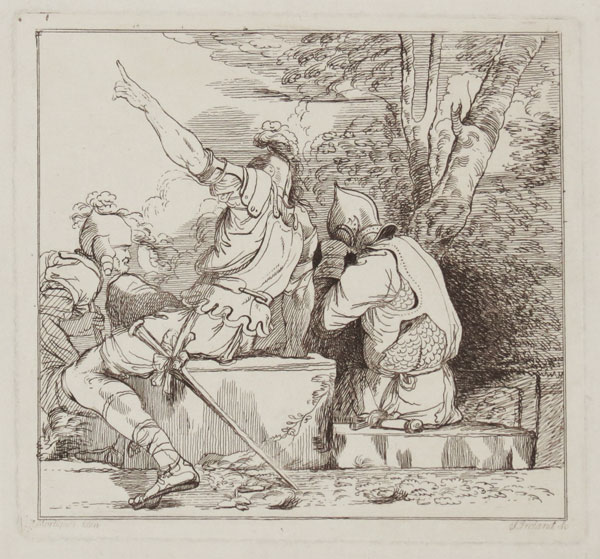 Captain standing at left, leaning on a stone block and pointing to right, where an armoured banditti sits, others in a line at left behind the block, only their heads seen. From a series of "Fifteen etchings dedicated to Sir Joshua Reynolds".