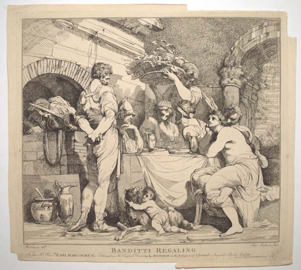 Banditti Regaling To the R.t Hon.ble Earl Harcourt, this Etching from the Original Drawing by Mortimer in the possession of S. Ireland is inscribed By his Lordships much obliged & obedient Serv.t S. I.