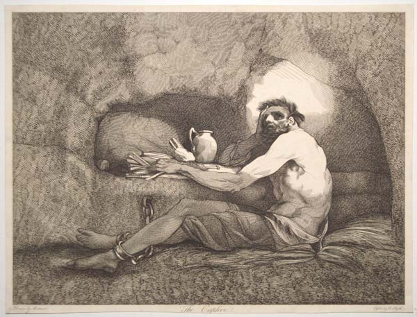 A captive sitting shackled in a cell. Subject from Laurence Sterne's 'A Sentimental Journey', published in 1768 as Sterne was close to death; the novel is partly autobiographical as it details the author's journey through France to the most southern point of Italy.