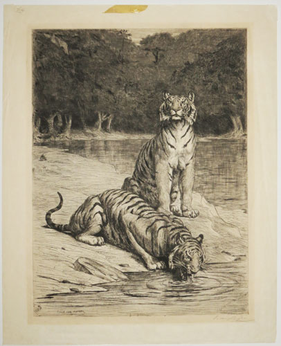 Evert van Muyden '87. [in plate]. E. van Muyden [signed in pencil]. [1887.] Etching on vellum, signed by the artist. 420 x 315mm (16½ x 12½"). Mount burn, taped stain in top margin, crease in margin. Bengal Tigers at a riverside, with a remarque of a tiger's head bottom left. Evert Louis van Muyden (1853-1922), born in Italy to Swiss parents. In 1894 the Art Institute of Chicago held an exhibition of over 200 of his 'Water Colors, Sketches, Pen Drawings and Etchings' including four states of this print. It was also illustrated in Frederick Keppel's 'The Golden Age of Engraving', 1910.