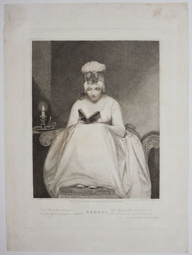 A girl sat reading a book with a candle on the table next to her, through the window can be seen the first rays of sun at dawn. Engraved from George Romney's painting 'Serena reading' (Preston, Harris Museum and Art Gallery), which takes as its subject the heroine of 'the Triumphs of Temper' by Romney's friend William Hayley. With a couplet from Hayley's poem below the image.