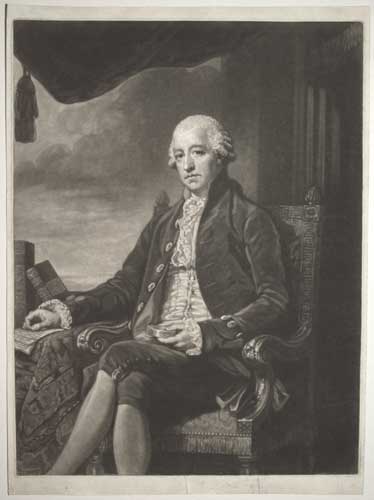 Portrait standing three-quarter length to right holding fishing rod and line, eyes to front, wearing black suit and hat, landscape behind. William Paley (1743-1805), the theologian and moralist. In 1782 he was appointed archdeacon of Carlisle and rector of Bishop-Wearmouth. He also wrote 'Evidences of Christianity'. Ex Collection: Earl of Bute. Horne: 92, ii/ii.