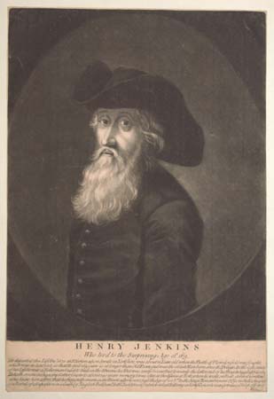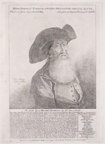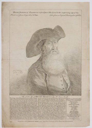 Henry Jenkins of Ellerton in Yorkshire, Who Lived to the surprizing Age of 169. Which is 16 Years longer than Old Parr. Taken from an original Painting done by Walker. The great Age of Henry Jenkins, by Mrs. Anne Saville. When I cam first to live at Bolton, I was told several particulars of the great age of Henry jenkins; but I believe little of the story for many years...where Henry jenkins, of Ellerton upon Swale, labourer, aged 157 years, was produced, and deposed as a witness. Epitaph, on a Monument erected at Bolton in Yorkshire, by the Subscription of several to the Memory of Heny Jenkins...A life of labour, and a mind at ease, He lived to the amazing age of 169. Was interr'd here December 6, 1670, And has this justice done to his memory, 1743.