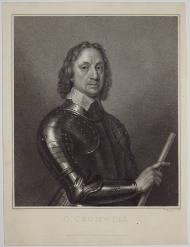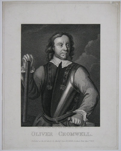 An impressive image of Oliver Cromwell (1599-1658), lord protector of England, Scotland, and Ireland. Engraved by Francesco Bartolozzi, cropping Robert Walker's half-length portrait of Cromwell with his Page (Aylesbury, Chequers Court) to eliminate the background and focus on Cromwell and his armour. De Vesme 798 (listed as 'published...Oct.r 11.th 1802')