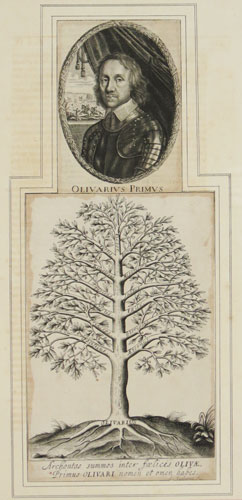 [Portrait of Oliver Cromwell, with olive tree inscribed with names complimentary to Cromwell] Olivarius Primus / Archontas summos inter foelicis Olivae, Primus Olivari nomen et omen habes.