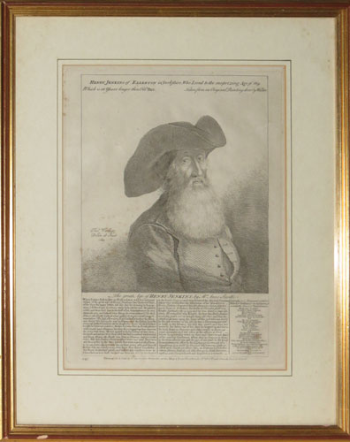 Half-length portrait of Henry Jenkins (died 1670), a reputed centenarian, below which is an engraved text biography written by Mrs Anne Saville and the text of a memorial inside Bolton-on-Swale church. His life supposedly spanned the reigns of monarchs from Henry VII to Charles II. In 1667 Jenkins stated on oath that he carried arrows to the English archers at the Battle of Flodden Field (1513). First published in 1752, this plate originally had the title outside the printed border, but the plate has been cut down and title lowered.