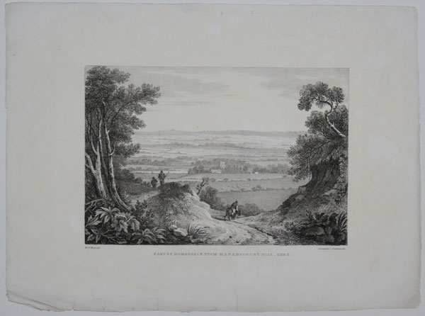A prospect of the Kentish countryside from rising ground; three figures to foreground, their backs to the viewer, one on horseback. From a folio of views. Not in Abbey Scenery.