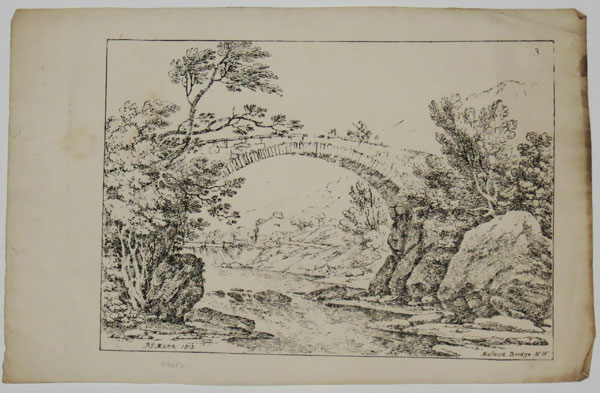 Stone bridge in Mallwyd, a village in Gwynedd, Wales, in the valley of the River Dyfi. Plate from one of several sets of 'Etchings of Landscape (in fact they were early pen lithographs) by Paul Sandby Munn (1773-1845). Munn was named after his godfather, artist Paul Sandby, followed his namesake into watercolour painting. He went on a sketching expedition to Wales with John Sell Cotman in 1802 and from 1807 was making use of the new medium of pen lithography, which he used in his several sets of landscape prints. Ex: Collection of the Late Hon. C. Lennox-Boyd.