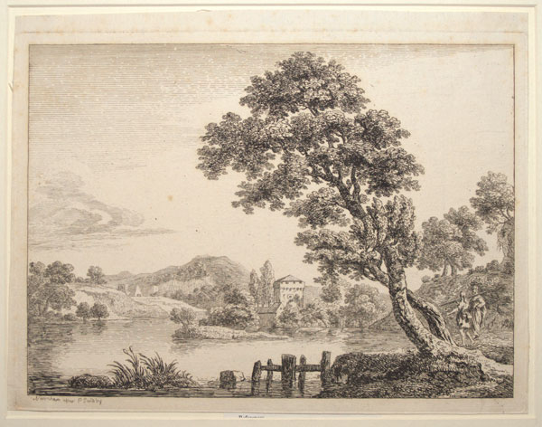 One of a set of four landscapes from late 1750s by Paul Sandby (1725 - 1809), watercolourist and printmaker. Born in Nottingham, he came to London in 1745 where he joined his brother Thomas at the Board of Ordnance. Sandby is best remembered for his watercolours and as a pioneer of the aquatint technique, although he also made a number of biting satires, targeting William Hogarth in particular.