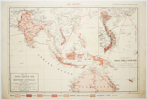A map of South East Asia, showing France's proposed annexation of Vietnam, completed the following year. It marks the colonies of the other European powers and shows the routes of the telegraph cables.
