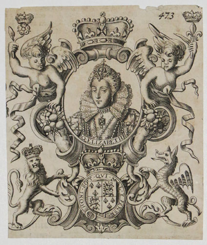 Queen Elizabeth, crowned by stars and encircled in clouds, carrying a fan of ostrich feathers. Originally published c.1617 with text above the stars and title (as above) and three lines of verse by John Davies under the image, the plate was cut down, losing the title and text, and used as frontispiece to Camden's 'Annales' of 1630. The original portrait, before trimming of the plate, was the only Jacobean portrait to refer to a privilege, bought by Hilliard for the substantial sum of 13s. 4d. a year. See A.Griffiths, The Print in Stuart Britain' cat.11, for the early state.
