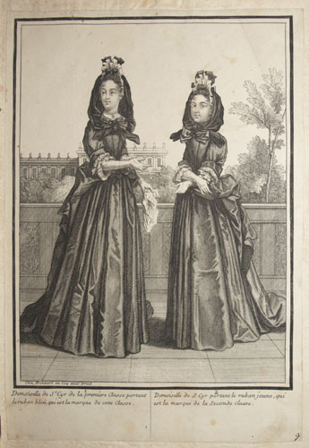 Two students attending the Maison Royale de Saint Louis boarding school for girls, dressed in uniforms indicating their class; blue for first, yellow for second. The school was founded in 1684 at St. Cyr by Madame de Maintenon, the second wife of Louis XIV. Printed by Henri II Bonnart (1642-1711) and from an album of 215 prints depicting different French costumes of the period, the majority are published by members of the Bonnart family. The four Bonnart brothers were renowed for the breadth of the works on contemporary fashion and costume.