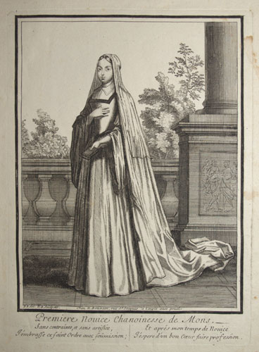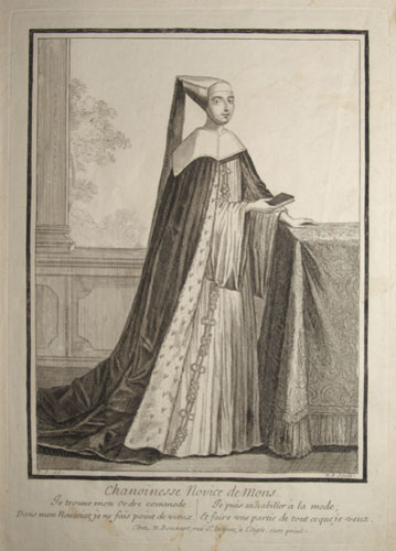 A fourth class student at Maison Royale de Saint Louis boarding school for girls, holding a book and described wearing a red ribbon. The school was founded in 1684 at St. Cyr by Madame de Maintenon, the second wife of Louis XIV. Engraved by Nicolas Arnoult (c.1650-1722), who also published his own work and was a recognised specialist in fashion and costume portraits.