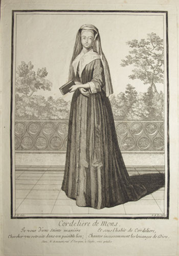 A third class student at Maison Royale de Saint Louis boarding school for girls, holding a fan and described wearing a green ribbon. The school was founded in 1684 at St. Cyr by Madame de Maintenon, the second wife of Louis XIV. Engraved by Nicolas Arnoult (c.1650-1722), who also published his own work and was a recognised specialist in fashion and costume portraits.