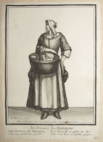 La Crieuse de Chataigne. Cette vendeuse de Chataigne, Fait un mediocre profit; Et si l'on croit ce qu'on en dit Elle boit bein ce qu'elle gaigne.