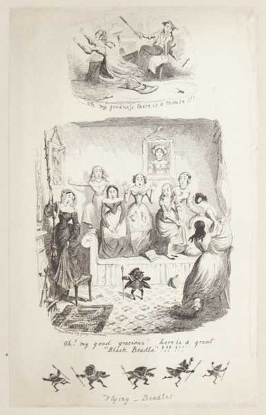 A satirical scene depicting two vignettes, the first; a gentleman seated with a book and a poker in his hand, a lady fleeing from the room, both having seen a small mouse, the table falling over;. The second; a company of ladies, shocked and standing on furniture to avoid an insect-like 'black beadle', who wears his robes of office and carries his staff, a maid to the left, ringing the bell; five smaller insect-like 'black beadles' below the image, fleeing to the left and right.
