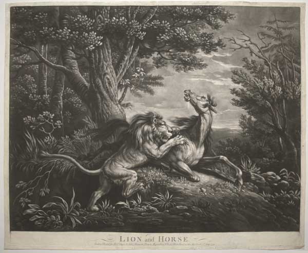 Pastiche of Stubbs' horse and lion subjects, issued as a companion to Robert Sayers' reprint of Stubbs' 'Lioness and Lion' by George Townley Stubbs. Lennox-Boyd (p.123) supposes that Collett's painting was commissioned by the publisher specifically with a view to being engraved as a pair for the Stubbs print. John Collet (c.1725-80) was a painter and prolific designer of predominantly humorous scenes for publishers to make prints from. See Lennox-Boyd p.23. Ex: collection of The Hon. Christopher Lennox-Boyd.