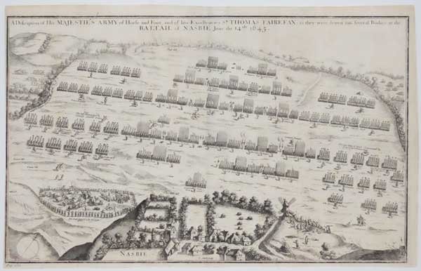 A topographical battle plan showing the army of Charles I and Prince Rupert facing that of Oliver Cromwell and Thomas Fairfax at the beginning of the Battle of Naseby in 1645. This is a reduced copy of the plate by Robert Streeter in Joshua Sprigg's 'Anglia rediviva', 1647. This example has the pagination guide lower right removed and a new one bottom left. See BM Y,1.123 for an earlier state and Y,1.122 for Streeter's original.