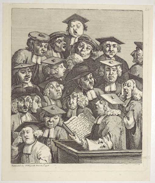 Copy of scholars at a lecture. Oxford scholars, portrayed as an assemblage of heads wearing square-topped, round cloth and felt caps and expressing varieties of boredom, listening to a reader in a lectern at lower right, his book inscribed, with various squiggles, 'Datur Vacuum' which translates as, 'Leisure time is given for...' The reader is intended as a portrait of Henry Fisher, Registrar of Oxford University (fl. 1737–61), who had agreed to be drawn by Hogarth. See BM Satires 2338 & Paulson 143.