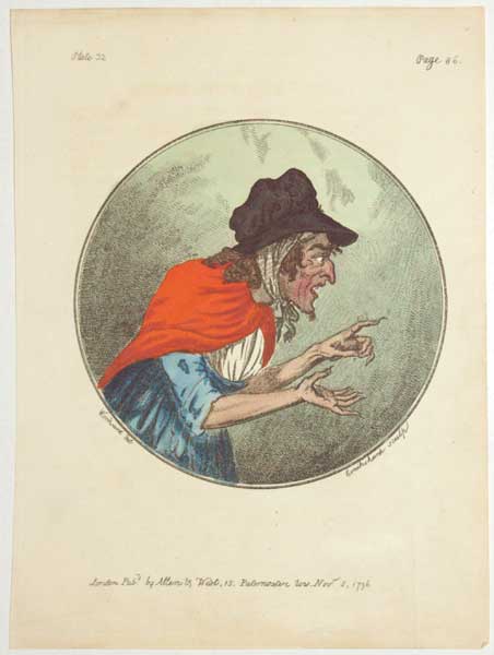 Design within a circle: a gaunt, hook-nosed woman, maybe a witch, shown three-quarter length in profile to the right, extending her right hand while pointing with her left. A plate from 'Eccentric Excursions, or. Literary & Pictorial sketches of Countenance, Character and Country'.