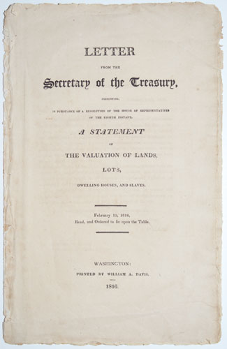A statement to Congress of the taxable value of each state, written by Alexander James Dallas (1759-1817), Treasury Secretary under President James Madison. Of the 18 states of the Union only 14 supplied statistics. According to the covering note: ''From the States of Southern Carolina and Louisiana, returns from the boards of principal assessors have not been received; and the returns received from the boards for the States of Virginia and Tennesse [sic] are incomplete and erroneous''.