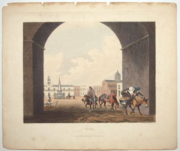 A busy market square, with an archway flying the Argentine flag. From Emeric Essex Vidal's ''Picturesque Illustrations of Buenos Ayres and Monte Video'', one of the earliest descriptions of Argentinian life. Born c. 1788, Vidal entered the Navy in 1808 and retired in 1862. He visited Buenos Aires and Montevideo twice at the end of 1816 (the year Argentina became independent), returning 1828-9. He was stationed on St Helena 1820-1, during Bonaparte's exile. Abbey Travel: 698. Vidal's text is available on Google Books.