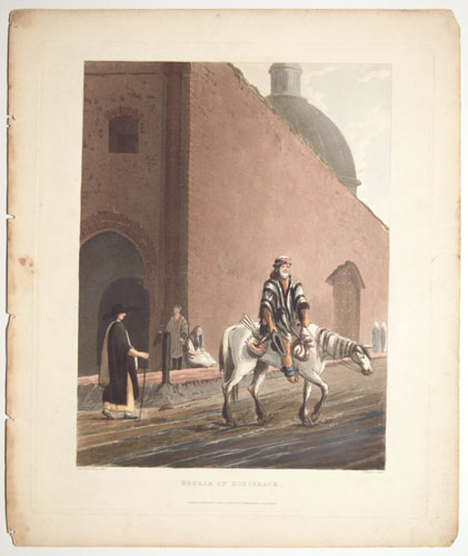 A beggar on horseback rides through the streets in Buenos Aires; two further beggars seen behind at the street corner as a clergyman passes-by. From Emeric Essex Vidal's ''Picturesque Illustrations of Buenos Ayres and Monte Video'', one of the earliest descriptions of Argentinian life. Born c. 1788, Vidal entered the Navy in 1808 and retired in 1862. He visited Buenos Aires and Montevideo twice at the end of 1816 (the year Argentina became independent), returning 1828-9. He was stationed on St Helena 1820-1, during Bonaparte's exile. Abbey Travel: 698.11. Vidal's text is available on Google Books.