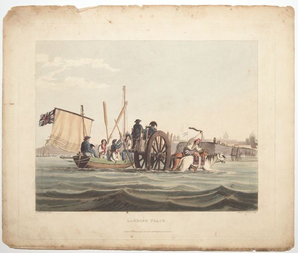 A small British dinghy arriving at the edge of the river to Buenos Aires where a horse and cart has backed into the water to carry the sailors dry to shore. From Emeric Essex Vidal's ''Picturesque Illustrations of Buenos Ayres and Monte Video'', one of the earliest descriptions of Argentinian life. Born c. 1788, Vidal entered the Navy in 1808 and retired in 1862. He visited Buenos Aires and Montevideo twice at the end of 1816 (the year Argentina became independent), returning 1828-9. He was stationed on St Helena 1820-1, during Bonaparte's exile. Abbey Travel: 698. Vidal's text is available on Google Books.