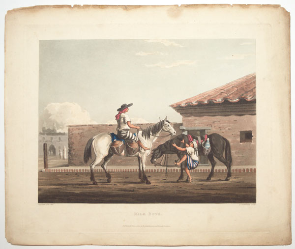 Two riders with saddles with special holders for jugs of milk. From Emeric Essex Vidal's ''Picturesque Illustrations of Buenos Ayres and Monte Video'', one of the earliest descriptions of Argentinian life. Born c. 1788, Vidal entered the Navy in 1808 and retired in 1862. He visited Buenos Aires and Montevideo twice at the end of 1816 (the year Argentina became independent), returning 1828-9. He was stationed on St Helena 1820-1, during Bonaparte's exile. Abbey Travel: 698. Vidal's text is available on Google Books.