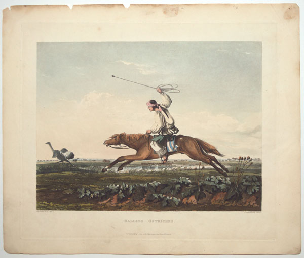 A gaucho chasing a Rhea, swinging a bolas. From Emeric Essex Vidal's ''Picturesque Illustrations of Buenos Ayres and Monte Video'', one of the earliest descriptions of Argentinian life. Born c. 1788, Vidal entered the Navy in 1808 and retired in 1862. He visited Buenos Aires and Montevideo twice at the end of 1816 (the year Argentina became independent), returning 1828-9. He was stationed on St Helena 1820-1, during Bonaparte's exile. Abbey Travel: 698. Vidal's text is available on Google Books.