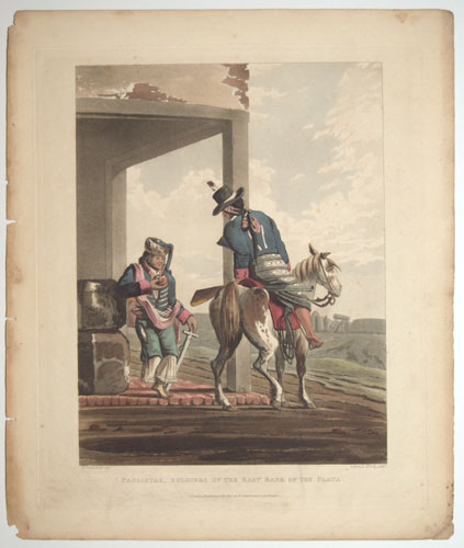 South American soldiers. One, with lace at the bottom of his trousers, is drinking chimarrao, a type of tea. The other man has a long plait; both are barefooted. From Emeric Essex Vidal's ''Picturesque Illustrations of Buenos Ayres and Monte Video'', one of the earliest descriptions of Argentinian life. Born c. 1788, Vidal entered the Navy in 1808 and retired in 1862. He visited Buenos Aires and Montevideo twice at the end of 1816 (the year Argentina became independent), returning 1828-9. He was stationed on St Helena 1820-1, during Bonaparte's exile. From one of the earliest representations of Argentinian life. Abbey Travel: 698. Vidal's text is available on Google Books.