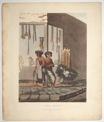 Two indigenous men, standing at a shop in the 'Indian Market', at the south-west end of the Callé de los Torres, Buenos Aires. Their goods include leather work like stirrups and whips, animal hides including jaguar pelts and rhea-feather dusters. From Emeric Essex Vidal's "Picturesque Illustrations of Buenos Ayres and Monte Video". Born c. 1788, Vidal entered the Navy in 1808 and retired in 1862. He visited Buenos Aires and Montevideo twice at the end of 1816, the year Argentina became independent), returning 1828-9. He was stationed on St Helena 1820-1, during Bonaparte's exile. From one of the earliest representations of Argentinian life. Abbey Travel: 698. Vidal's text is available on Google Books.