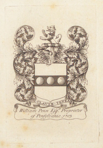 Bookplate of William Penn (1644-1718), founder and 'Absolute Proprietor' of the Province of Pennsylvania, featuring his armorial.