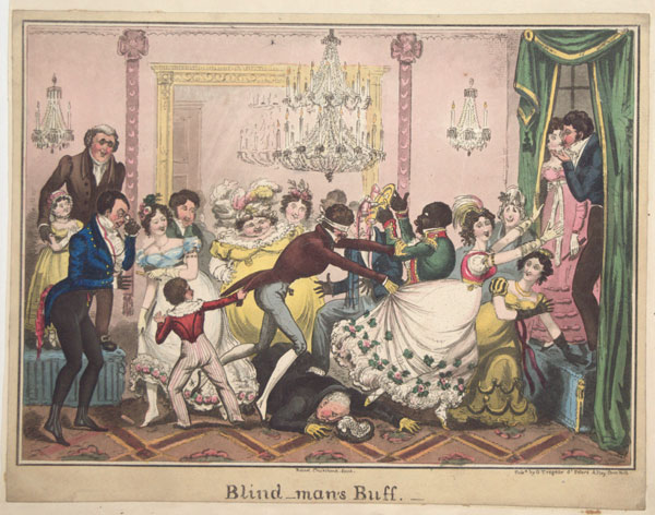 A rowdy game of blind-man's buff at a soirée, with a blindfolded man causing havoc by seizing the dress of a fleeing woman, knocking over an elderly man and knocking a tray of glasses out of the black servant's hands. Not in BM.