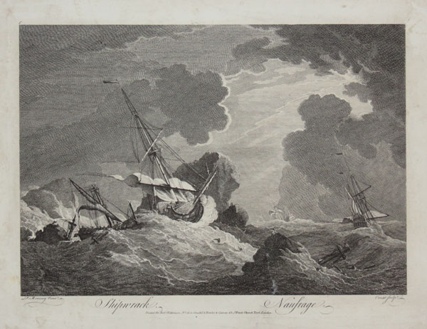 Dramatic shipwreck scene after Peter Monamy (1681-1749), engraved by P.C. Canot. London-born painter Monamy (he was born in the Minories and baptized at St Botolphs Aldgate) 'emerges with Samuel Scott as one of the two leading figures in the first generation of British marine painters [...] he worked industriously for at least forty years and has left us a rich heritage of paintings illustrating the nation's naval history in the first half of the 18th century' (E.H.H. Archibald, 'Dictionary of Sea Painters').