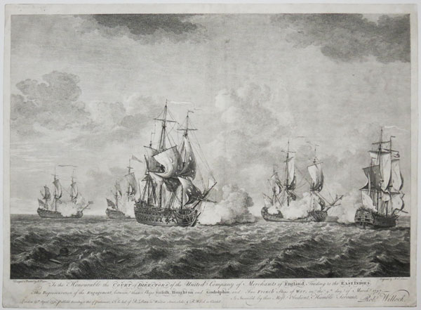 To the Honourable the Court of Directors of the United Company of Merchants of England, Trading to the East Indies, This Representation of the Engagement, between their Ships Suffolk, Houghton and Godolphin, and Two French Ships of War; onthe 9th day of March 1757. Is Inscribed by their Most Obedient, Humble Servant, Rob.t Willock.