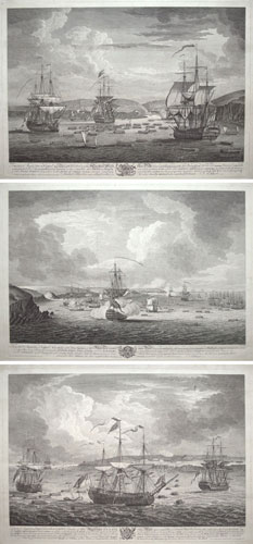 Three engravings celebrating the capture of the French island of Belle Île (off the Brittany coast) in 1761, during the Seven Years' War. As the Royal Navy began to dominate the seas Britain started to pick off France's colonies, including Canada, before lauching this attack on a part of France itself. Initially repelled, the attack was continued with reinforcements and the island was eventually captured. Unable to counter-attack, the French told the British they could keep it if they wanted, but they found that a British base so close to the French mainland was a real problem so, in the Treaty of Paris that ended the war, Belle Île was swapped for Minorca, which France had captured earlier in the war. Parker 69.